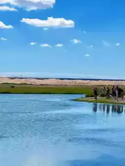 Here is a rare small patch of grassland like an oasis! There are leisurely camels and ducks, as well as sand lizards and wild rabbits, cranes flying back and forth catching fish, and recently swans too. It’s like a scene from the animal kingdom, fascinating.