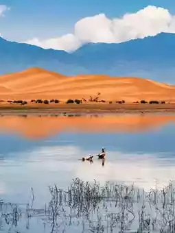 Deep in the Tengger Desert are many lakes, the most famous being Tong Lake, Swan Lake, and Moon Lake. The most beautiful sky I’ve ever seen is in Tengger. Blue sky, white clouds, desert, oasis lakes... colliding together, it’s a breathtaking clash of beauty.