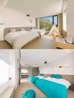 The rooms feature a cream-colored style with projectors, perfect for movie lovers. The guesthouse offers many family rooms with tents inside that children love - a must-try for those traveling with kids.