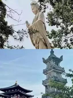 4. South Sea Guanyin Statue: A 33-meter-tall outdoor bronze statue standing on Longwan Hill, overlooking the East China Sea in solemn grandeur.