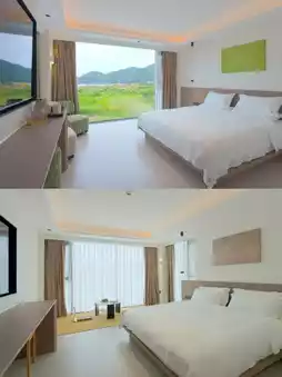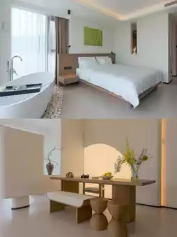The homestay is tucked by the sea in Tawan Village, just a 5-minute walk to the big sandy beach. The best part is that some room types feature panoramic floor-to-ceiling windows and extra-large balconies, allowing you to lie in bed and enjoy the seamless view of sea and sky, with mountains and fields in full sight. The modern minimalist design is super photogenic, with pure white bed canopies and natural wood furniture—every shot looks like an Instagram masterpiece.
