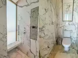 The bright bathroom, with its marble double washbasin vanity and a large mirror, not only gives the restroom a sense of space, but also gives the entire bathroom a sense of luxury.