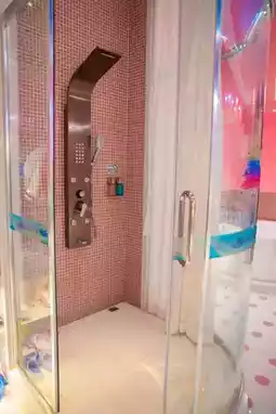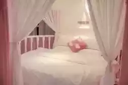 The princess bed has two levels and can sleep four people. The room has a large bathtub, which is very enjoyable. The furniture is smart. I like the shower, which has a shower head with multiple water modes, including rain, massage, or mist, giving a vacation feel.