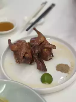 The skin is golden and crispy, and it makes a crisp sound when you bite it. The pigeon meat is tender and juicy.