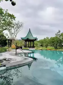 The bustling charm and elegance of Hengqin are perfectly balanced at MGM Grand Zhuhai. This high-end residential and hotel complex features an infinity pool that serves as a hidden urban oasis. The pool boasts a modern design, surrounded by greenery and wooden elements, creating an ideal retreat amidst the city's hustle and bustle.