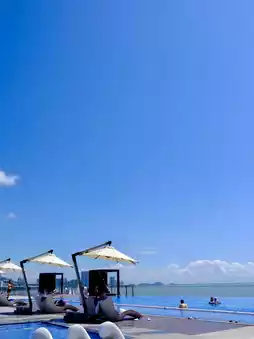 Nestled along the coastline of Xianglu Bay, the InterContinental Zhuhai boasts an infinity pool that seamlessly merges with the ocean, creating a breathtaking visual harmony. Standing by the poolside, one can gaze into the horizon where the blue sky and sea blend together, immersing the senses in an endless expanse of blue. The pool's minimalist and elegant design features gently curved edges that extend outward, giving the illusion of floating on water.