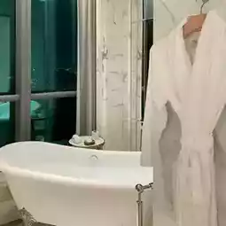 Although the National Day suite voucher couldn't be redeemed, the room facing Macau was a delightful surprise! The layout of the 60-square-meter standard room is ingeniously designed, featuring a walk-in closet, double sinks, a vintage bathtub, and a sofa and desk by the window. The flow is seamless and exudes sophistication. The Tivoli sound system and Villeroy & Boch bathtub add a touch of luxury, though the hardware maintenance shows signs of wear despite the hotel being open for four years.