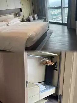 Right downstairs is the Shangdu shopping district, perfect for strolling, eating, and drinking. It’s a 10-minute drive to Lovers’ Road coastline, and Zhuhai Fisher Girl and Sun and Moon Shell are both within a half-hour drive. It’s also convenient to get to Chimelong Ocean Kingdom, less than 40 minutes by taxi. At night, the city’s neon-lit skyline viewed from the floor-to-ceiling windows in the room makes every snapshot look like a masterpiece.