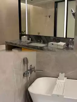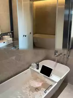 The moment I opened the door, I felt instantly comforted! The room is decorated in understated luxury, with bedding soft as if wrapped in clouds. Before sleeping, I found a handwritten welcome card and a small box of macarons on the bedside table, which was so heartwarming. The bathroom is huge, with a thoughtful double sink design, and there’s a Bluetooth speaker by the bathtub—listening to music while soaking away the day’s fatigue was pure bliss.