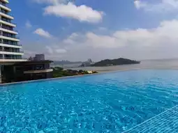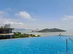 The terrace of the hotel's sea-facing room has a panoramic view of the Sun and Moon Shell, the sea view of Xianglu Bay, and the infinity pool of the seaside hotel.