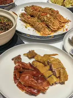 Half is the original salt-baked chicken, and the other half is the roasted chicken with crispy skin and tender meat. It satisfies two tastes at once. The salt-baked chicken retains the most original tenderness of the chicken, paired with ginger and garlic sauce, refreshing and delicious, while the roasted chicken is golden and crispy on the outside and juicy inside. Take a bite