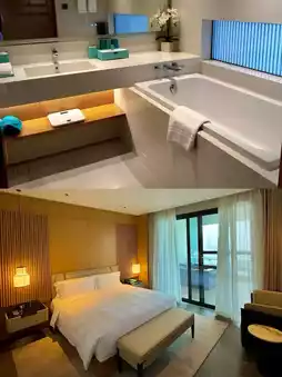 Ocean Spring Resort's Grand Metropark Hotel🏨 consists of two five-star standard hotels (Neptune Hotel and Uranus Hotel), 12 Mediterranean-style hot spring♨️ villas, and 4 lakeside suites. Most rooms feature scenic balconies🪷 with ocean views, perfect for a relaxing vacation🏖️.