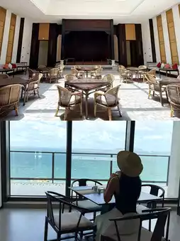 The wooden tea room is filled with a faint tea fragrance, with intangible cultural heritage Guangcai porcelain cups🍵 Tea lovers can enjoy tea while watching the sea, it’s incredibly relaxing~