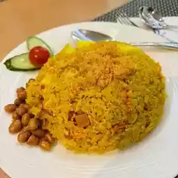 The shrimp paste seafood fried rice is loaded with ingredients like shrimp, squid, and pork neck. The taste is quite flavorful, but the shrimp paste flavor is insufficient.