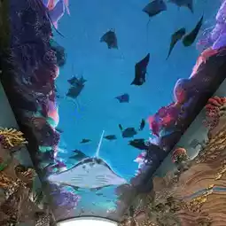 and gaze at the whale sharks 🐋 through the massive glass screen.