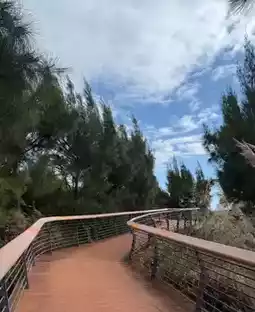 10-minute walk away, featuring soothing blue-white colors. The transparent viewing deck on 2nd floor captures waves crashing against the shore