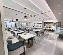 Restaurant: The breakfast area features an open layout, with black and white pendant lights hanging over neatly arranged marble dining tables🍽️. Floor-to-ceiling windows bring in plenty of natural light, and the dining tables display fresh fruit and freshly baked bread🥐, starting your day full of energy here!