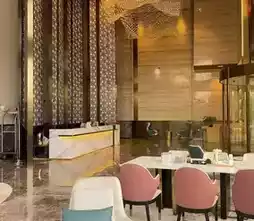 Lobby: Step into the hotel lobby, where the high ceiling design is paired with geometric patterned columns, and the revolving door reflects warm golden light✨. The marble front desk combined with metal lines exudes a sense of luxury, while the powder blue contrasting sofas in the lounge area🛋️ make every snapshot a stylish scene~