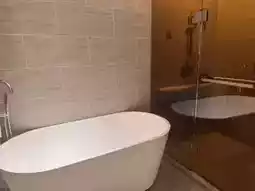 The most delightful surprise was the standalone bathtub in the bathroom. The thin-edged oval bathtub by O'Kerin resembled a ship docked in the clouds, while water droplets clung to the frosted glass of the adjacent shower room. Turning on the faucet, hot water infused with lavender fragrance overflowed the tub, washing away the day's fatigue in a cascade of bubbles.