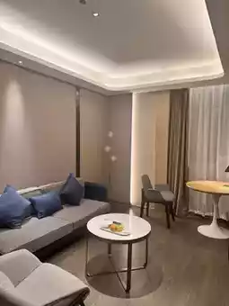 The elevator stopped gently on the 13th floor. As I opened the door, I almost thought I had stepped into a Nordic design studio. A gray-blue fabric sofa adorned with deep-sea-like cushions, a round marble coffee table holding freshly cut apples and oranges glistening in a glass bowl, and a disposable bathtub cover printed with "Healthy Travel"—every detail exuded thoughtful care.