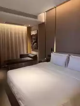 As dusk swept through the revolving doors of the hotel, I stood in the lobby, gazing up at the streamlined wooden patterns on the ceiling. Warm golden light cascaded down the curved structure, as if the entire sunset had been shattered and infused into the marble floor. The receptionist softly said, "Welcome," her voice filtered to a soothing gentleness.