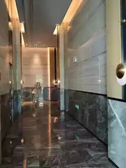 The lobby is elegantly designed, exuding a sophisticated ambiance under warm yellow lighting 💡. The display shelves feature thoughtfully curated ornaments 🎁, and there's a full rack of books for you to browse at your leisure 📚.