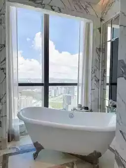 Our sea view room had an unparalleled view, especially the marble bathroom with its floor-to-ceiling windows and large bathtub by the window.