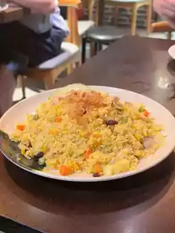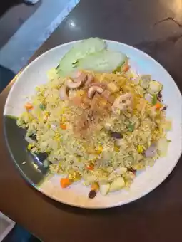The Pineapple Chicken Fried Rice ๐ is perfectly cooked with distinct grains, featuring pineapple ๐, pork floss ๐ท, cashews ๐ฐ, cucumber ๐ฅ, raisins ๐, carrots ๐ฅ, chicken ๐, egg ๐ณ, corn ๐ฝ, and green peas ๐ซโa truly rich combination ๐.