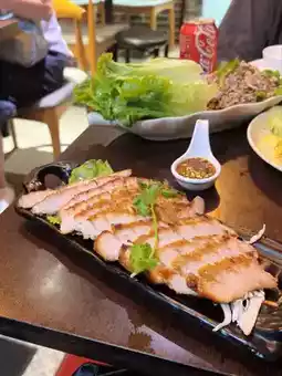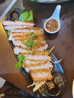 The Grilled Pork Neck ๐ is grilled to a slightly charred and crispy perfection ๐ฅ, with a tender and fatty aroma ๐.