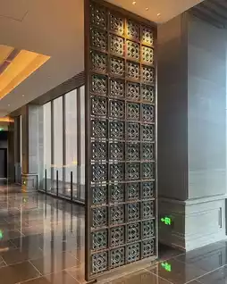 1️⃣ Giant stainless steel hollow screen in the lobby: at 10 a.m., sunlight passing through casts beautiful light and shadow patterns on the floor