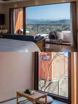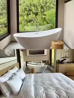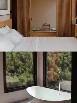 The room is designed in log style, and the oversized floor-to-ceiling windows allow sunlight to fill the entire space☀️. The bedding is super comfortable, lying on it feels like being wrapped in a cloud, and you can sleep until you wake up naturally! Each room is also equipped with a private bathtub. Taking a bath at night and looking at the starry sky is so comfortable🛁✨.