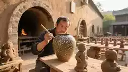 Boshan Yanshen Ancient Town is transformed from 13 ancient kilns. At the "Raindrop Glaze" workshop, craftsmen use bamboo knives to paint dots. In the studio of clay sculptor Zhang Xinzhong, adorable clay dolls are drying.