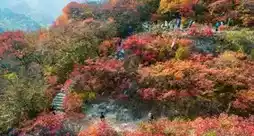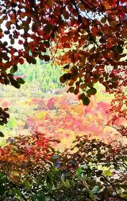 Reaching the viewing platform halfway up the mountain, the view suddenly opens up. The distant mountains are dyed with layers of forest in red, yellow, and green, like a richly colored oil painting. The small village in the valley is hidden deep among the red leaves, with smoke curling from the rooftops, matching the red leaves to create a paradise on earth.