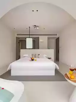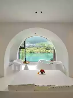 The room design is natural and simple! You can see the river view when you open the panoramic floor-to-ceiling windows. The bathtub design is also very romantic. It is really nice to enjoy the mountains and rivers in the distance while taking a bath. The bed is super comfortable to sleep on. It feels like a home theater at night. The smart toilet and mini refrigerator are also available, full of life details.