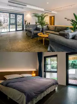 🛏️In the rooms, the simple modern decor paired with large floor-to-ceiling windows allows sunlight to pour in unreservedly, creating a warm atmosphere. The huge windows frame the mountain scenery into a flowing "Ziyang Mountain Landscape"🖼️ - you can take in all this beauty just lying in bed. The navy blue fabric sofa and rattan wooden chairs create a strong Japanese home feeling that instantly relaxes you. Smart surround sound speakers, projection🎦 screens, and cotton-linen bedding - every detail reveals thoughtfulness and comfort.