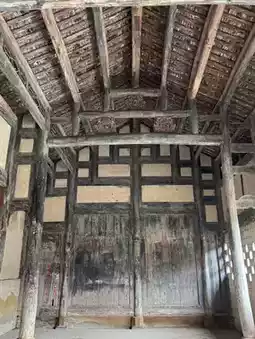Opera Stage: Upon entering through the door, there's an entrance hall with an opera tower above and an aisle below. The opera tower features a raised-beam wooden structure that remains well-preserved. The wooden stage rails were originally decorated with carvings of figures, qilin, phoenixes, deer, horses, treasure vases, and flowers, though only some patterns remain today.