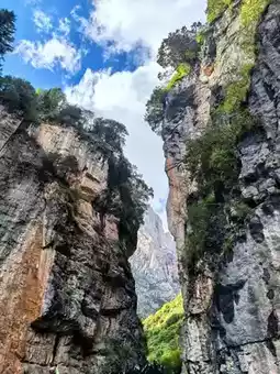 Tall mountains on both sides, only a narrow strip of sky visible when looking up