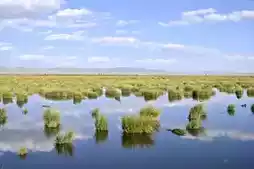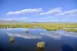 The deep blue lake surface is like a clear mirror, embracing the blue sky and white clouds.