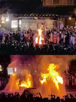 When night falls, the real highlight is just beginning. The millennium-old intangible cultural heritage craft "Iron Flower Beating" will make a stunning appearance. Artisans scoop up 1600℃ molten iron with iron spoons and strike it vigorously on wooden boards, instantly splashing thousands of golden sparks that can reach over ten meters high, like meteors falling on terraced fields or a golden waterfall pouring down.