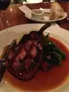 My wife and I had the happy hour menu with small plates. We both had bockwurst which I believe was home mad. No matter though it was very good and served with a cabbage that was somewhat mild sauerkraut. Something that we are seeing more and more of, they charged $3 for four slices of bread. Because it was happy hour the wine was $5 a glass and it was a very good Italian table wine, well worth it. Also note that the happy hour tables are high bar tables near the bar. The bar stools and not as comfortable as the dining room chairs. Service was very good but we did have to remind the gentleman about serving our wine.