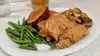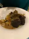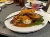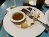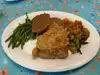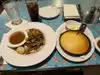 Tried the sampler dish - fried chicken - good either with crispy skin, pot roast - very nice and tender meat, and meatloaf - which was ok. My other half had the salmon which was nicely cooked. Dessert was chocolate cake and deconstructed apple crumble, both with ice cream and both very nice. Very filling meal. We had the package that included reserved seating at Fantasmic and a meal that included an alcoholic drink, entree and dessert. Overall a good meal with a very friendly server.