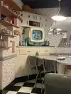 Food was aweful cold and stodgy not what we expected from an American Diner?! All pot roast meat loaf and fried chicken!!!! Like a prison “Mom” told use to keep elbows off the table, eat up all our veggies, and to do our chores cleaning the table?! That’s taking theme to the extreme! Would highly not recommend!!!!!!