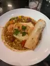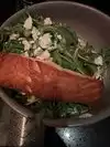 We entered into the hotel to get to the restaurant. We were promptly seated. Waiter was very nice and made good suggestions. We had burrata for starter, however it was flavorless. Then had a Caesar salad to share. It was a large portion so was good to share. Our entrees were scallops with creamed spinach. I had salmon with wild rice. We had creamed spinach as a side. The wine was fine. Everything was cooked good but it was all lacking flavor. It was a bland meal overall.