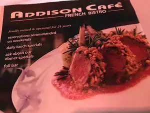 Their were four of us for lunch and good conversation. Addison Cafe has been in operation for 35 years. The ambiance was excellent. Seating was comfortable and very low noise level which made for good conversation. They have an extensive menu and very reasonably priced. I had the trout almandine. The others had sole , chicken piccata, and a chicken caesar salad. We shared a piece of cappuccino pie. I would definitely recommend and return. A great experience and reasonable.