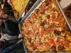 We went as a group of three and ordered the tray sized pizza, eight rectangular pieces and we took home 3 pieces for later. When you add toppings they really do ADD toppings. We will know better next time to order less topping to enjoy all of the flavors. Spicy jalapeño peppers were amazing, get them with pepperoni and one other topping and you should be all set.
