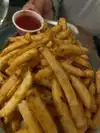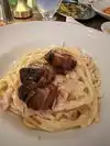 The decor was very beautiful especially the lemon trees on the ceiling. It was very busy and the music was pretty loud inside but not loo loud that you still have a conversation without yelling. They had lots of outdoor seating even for larger groups. Loved the vibe and ambiance. Service was kinda slow through although they were quick to fill up our water glasses but the entrees took about an hour to come out. We also ordered truffle fries which came out after about 20 minutes but were worth the wait. The bucatini carbonara was very delicious, pasta cooked perfectly although I felt that the pork belly seemed a bit out of place. The Ravioli all’ Aragosta (lobster ravioli) was also pretty delicious. Fettuccini scoglio was a spicier pasta with a good amount of seafood, the pasta was a bit overcooked but the sauce tasted really good. If you want the pasta in the cheese wheel they only serve it Sunday through Thursday. I saw this on the menu so wasn’t surprised since we ate there on a Saturday night.