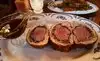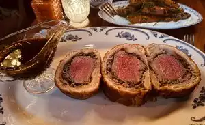 Obviously, we loved the Beef Wellington. The shrimp cocktail and corn side were also delicious. Wine pairings, decor and service were all first rate... we did find the tuna carpaccio a little salty and the chocolate cake "looked" better than it tasted... the mint ice cream served on the side of the cake tasted a little "too minty"... like chewing gum... would have been better if made with real mint rather than extract, IMO. Be forewarned... listen to your server... the restaurant is DARK and the text on the menu is TINY... so listen very carefully... you won't be able to read a thing...