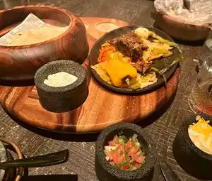 My husband was excited to try out Amaya. We loved enjoyed the ambience of the restaurant! It’s unique. We had a nice server and she was responsive however the bar was slow and our drinks came after our food. The server responded to this appropriately. :) oh and the busser was friendly and responsive. I ordered the avocado tacos and Mexican street corn. I had thought the server said the tacos came with beans and rice but I must have misheard her bc it was only 2 small Tacos on the plate so I was glad I ordered the corn too. Portions appeared to be very small for the price but I ended up feeling full at the end of it all! Idk if it’s from the fat in the avocado and mayo in the corn or what! Flavors were very good. My husband ordered fajitas and was very happy with his dish and portion size. His espresso martini tasted moderately spicy (???) which we were confused by. We read the menu and the martini didn’t seem to list any spicy ingredients so I’m not sure what’s going on there. Fire dancers came out during the meal which was a fun little performance. Overall we would definitely return here. *we made our reservations about 1 week in advance.