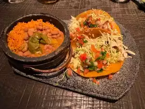 Mid level experience. Drinks were okay. Waited way too long for tacos; manager came to our table and others to apologize for the delay. The salsa for chips was really good. I ordered grilled fish tacos (sea bass) and they were mediocre at best with dry rice and okay beans side. Price was $24 for 2 tacos. We ate here out of convenience only. I’d try something with more bang for the buck if needed.