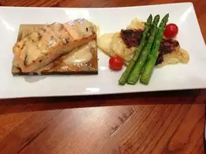 We were staying at the Hilton San Antonio in which this restaurant is located and had been traveling for two weeks, so decided to take it easy and "eat in." The decor was ok, but in general this Hilton was a bit tired so this wasn't a surprise. We wondered what we would find, especially since the most recent TripAdvisor review was almost 18-months old. It was Valentine’s day and the desk said no reservation was necessary; the restaurant was mostly empty. This was fortunate because due to the hard interior and lack of carpeting and tall ceiling it would have undoubtedly been loud and reverberant. We had already snacked at the Hilton Exec lounge so we weren't terribly hungry. We ordered a glass of Canyon Red Cabernet and the grilled salmon. The wine was pleasant and the salmon perfectly prepared accompanied by excellent grilled asparagus and tasty au gratin potatoes. The servers were most pleasant, though at first the service was a bit slow. The dinner was a lovely surprise and just what we had in mind.
